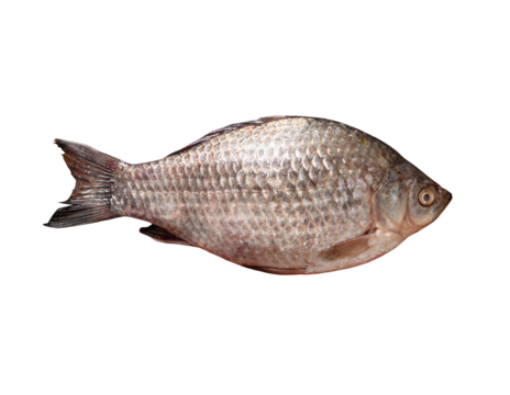 Side view of a fresh prussian carp isolated on transparent background, ideal for food and wildlife concepts