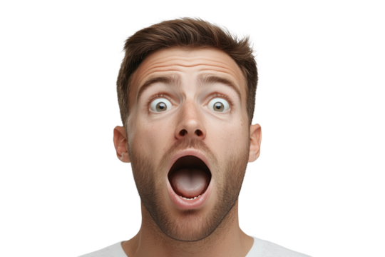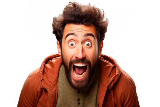 Hombre expresando sorpresa y emoción de shock. Boca abierta y grandes ojos bien abiertos. aislado sobre el fondo transparente.