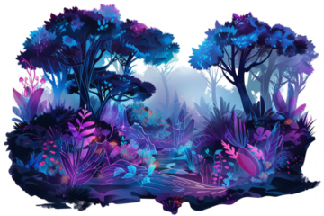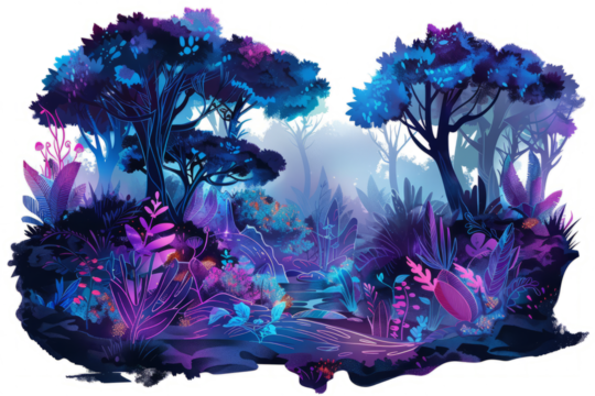 A forest landscape with glowing, neon-lit trees and plants, set against a white background.