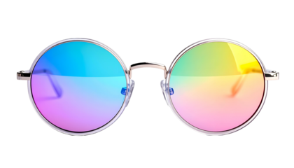 Round, silver-framed sunglasses with rainbow-colored lenses against a black background