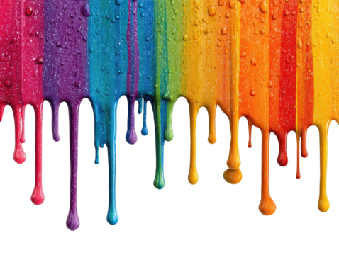 Vibrant dripping rainbow stripes against a black background.  Water droplets cling to the colorful, viscous paint streaks