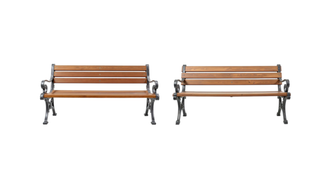 Outdoor park bench seating wooden slats and metal frame public furniture for resting and relaxing in garden on transparent background