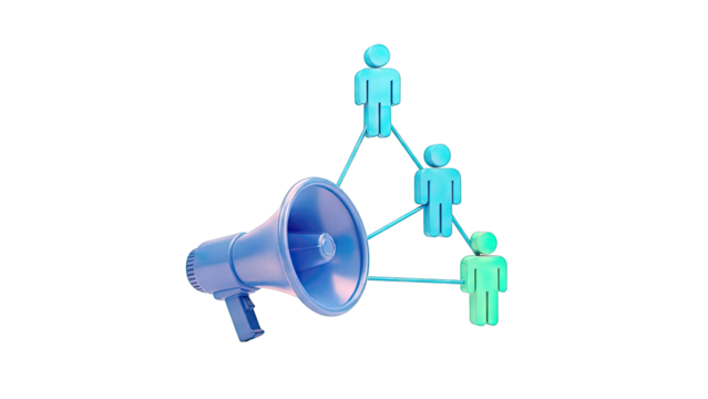3D Megaphone on puzzle pieces with people icons on transparent background