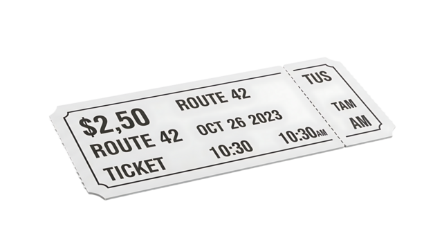 Bus Ticket Showing Route Date and Time in Black and White Design for Travel and Transportation
