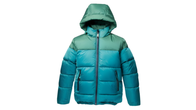 Teal blue puffer jacket with hood for kids isolated on transparent background