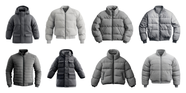 Down puffer jacket coat technical fashion illustration with stand collar, zip-up closure, boxy fit, crop length, wide quilting. Flat front, back, white, grey color style. Women, men, unisex top CAD