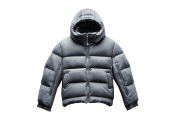 Stylish gray puffer jacket with a transparent background, trendy design.