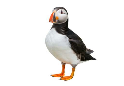 Charming puffin with a bright orange beak and black-and-white plumage, standing proudly. PNG format