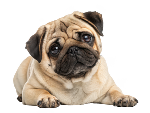 Adorable fawn-colored pug with expressive, dark eyes and wrinkled skin, lies relaxed in a studio setting with soft, diffused lighting, gazing slightly upwards, isolated on transparent background.