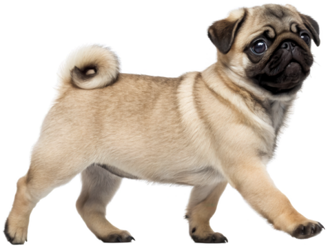 Adorable fawn-colored pug puppy with soft, wrinkled skin and large, expressive brown eyes is captured in a playful walking pose, showcasing its compact body and, isolated on transparent background.