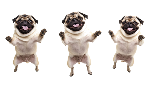Funny pug dog looking up with paws raised isolated on transparent background