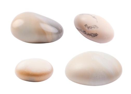 Conjunto de hermosas piedras de río suaves del mar, aisladas en fondo transparente. Guijarros pulidos.