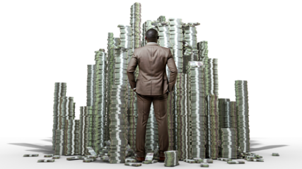 Rich African American budinessman standing facing huge pile stacks of Botswana pula notes. Business man looking at alot of heaped bundles of money isolated on transparent background