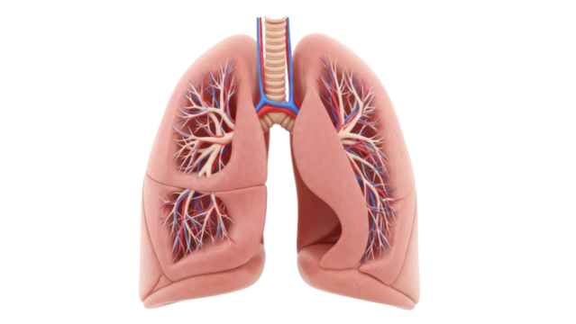 Plastic lungs illustrating the respiratory system with trachea and bronchi, providing a clear visualization of pulmonary function on a transparent background