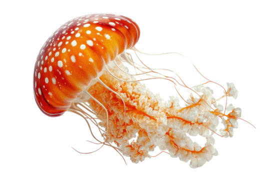 Close-up of four orange-red jellyfish, translucent,  with white-pink dots
