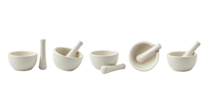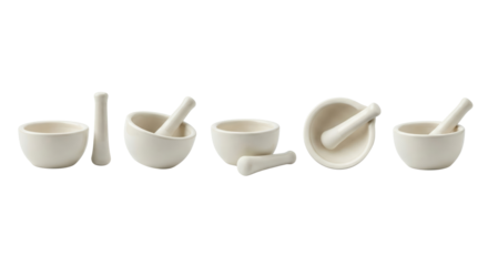 Set of White Ceramic Mortar and Pestle Collection on White Background