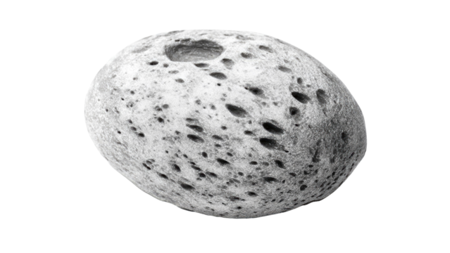 A gray, porous, oval stone, resembling pumice or volcanic rock, with numerous small and large indentations, isolated on a solid background. background removed