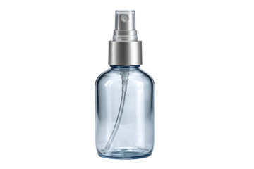 Clear glass spray bottle with silver pump dispenser on black background image