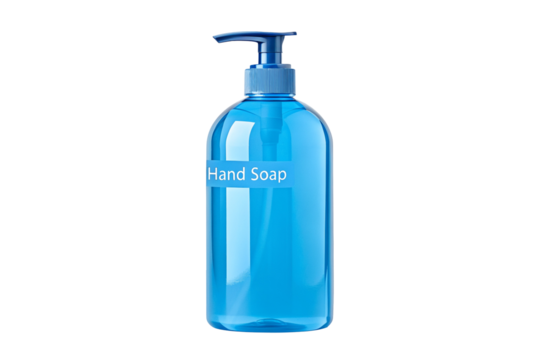 Blue detergent bottle with yellow cap on transparent background