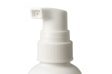 White plastic pump spray bottle head detail creating a fine mist, cosmetic dispenser with a transparent background