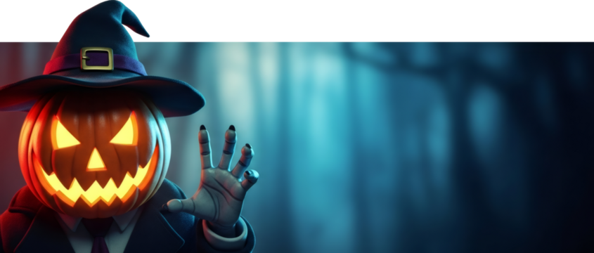 Spooky pumpkin head with glowing face and witch hat for halloween invitation or party. Banner with copy space on transparent background