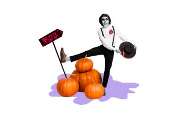 Composite photo collage of happy muertos guy masquerade halloween party nameplate pointer boo pumpkin isolated on painted background