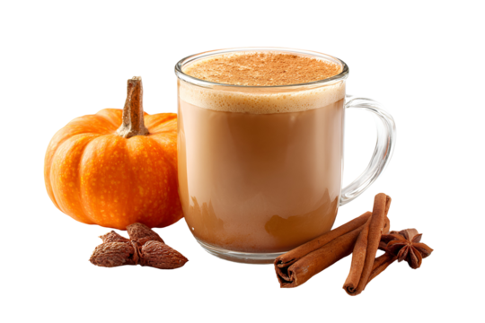 Delightful pumpkin spice latte with whipped cream beside a small pumpkin and cinnamon sticks isolated on transparent background