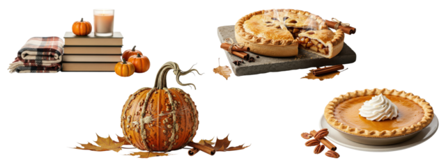 Cozy fall decor with candles and blankets, apple pie, decorative pumpkin, and pumpkin pie with whipped cream