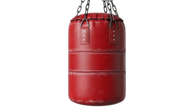 Red punching bag hanging from chains isolated on a transparent background hanging punching bag boxing