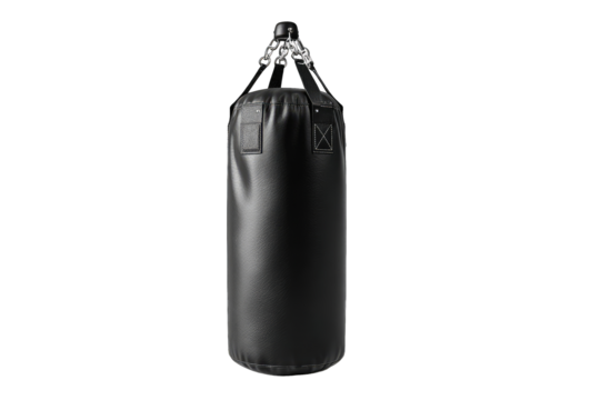 Vintage leather boxing punching bag hanging, isolated on transparent background, PNG, cut out