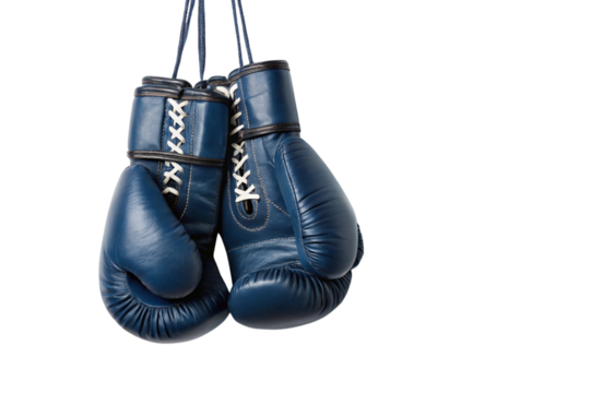 Pair of blue leather boxing gloves hanging isolated on transparent background