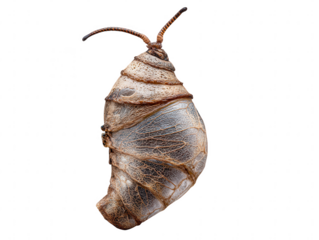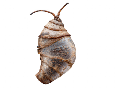 Detailed macro view of a brown insect pupa with intricate textures isolated on transparent background