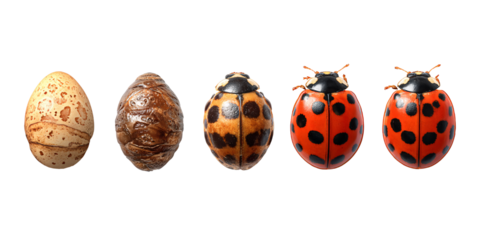 Ladybug life cycle stages, from egg to pupa to adult ladybug, showcasing complete metamorphosis and transformation on a black background