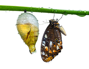 Butterfly emerging from chrysalis isolated on transparent background