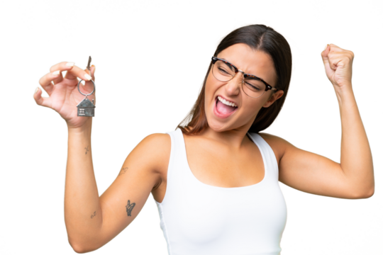 Young caucasian woman holding home keys isolated on green chroma background celebrating a victory