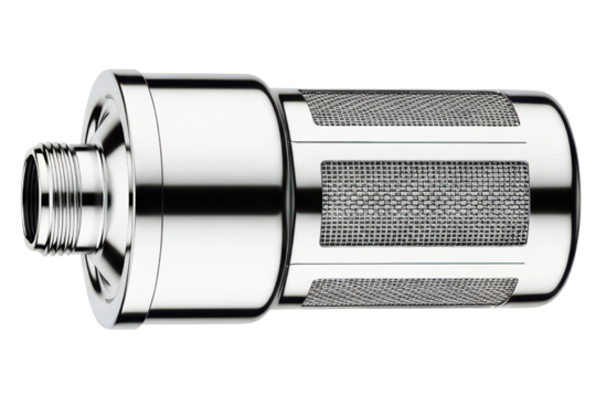 Chrome shower head water filter with a visible mesh screen on a transparent background