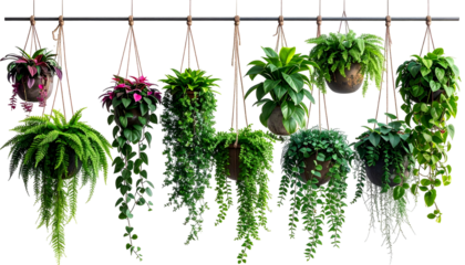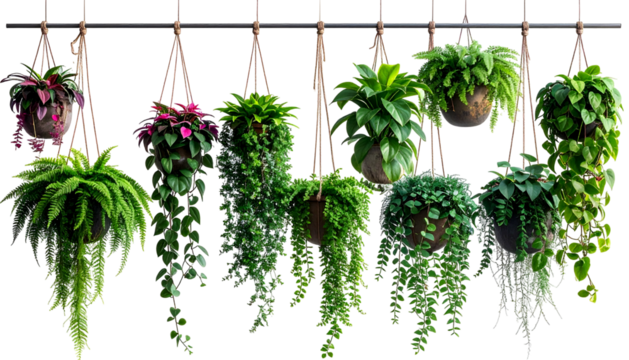Several hanging plants in baskets, suspended from a horizontal rod, varying greenery