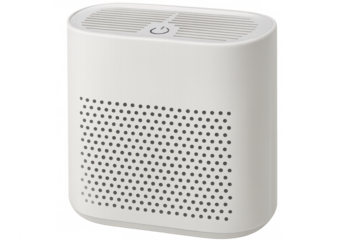 Sleek white air purifier featuring a perforated design and power button, isolated on a transparent background for easy integration