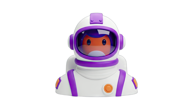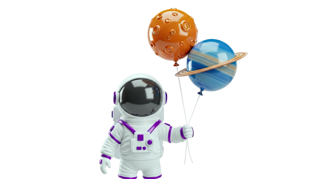 Astronaut amid daisies in fantasy cosmic scene with planets on transparent background