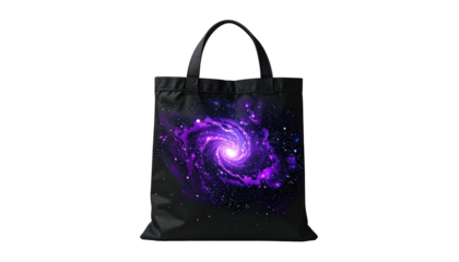 Black tote bag displays swirling, bright purple nebula artwork on its surface; dark background