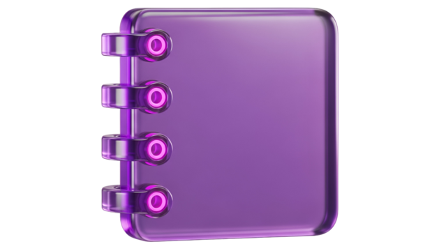 A 3d render of a sleek purple translucent notebook icon with glowing spiral binding details