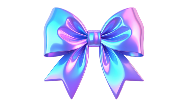 Iridescent purple bow with holographic effect, centered on a black background, suggesting a digital 3D render