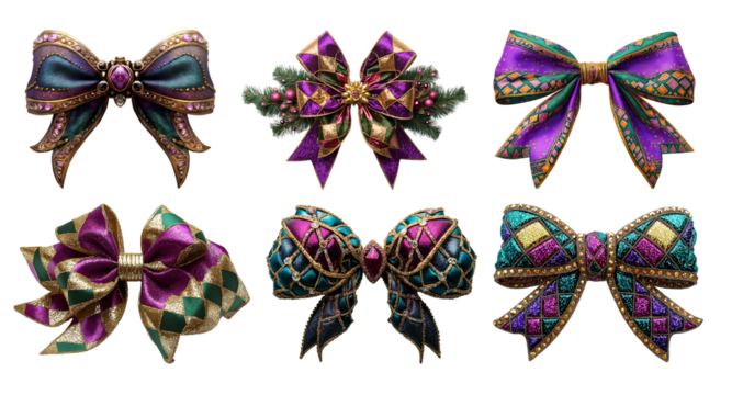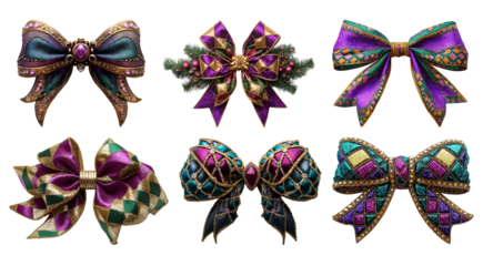 Elegant Festive Bows with Jewel Accents in Rich Colors and Intricate Designs on transparent background, png
