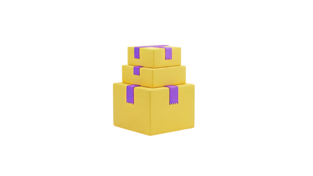 3D Stack of yellow gift boxes with purple ribbon on transparent background