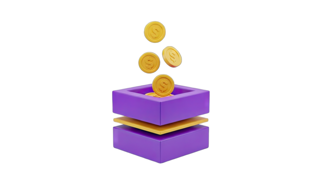 Stack of Purple Boxes with Gold Coins Falling into the Top One on a Transparent Background