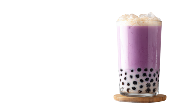 Refreshing purple bubble tea with tapioca pearls on a wooden coaster.