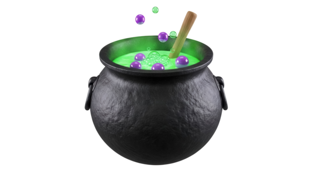 Witch s cauldron with green potion and purple bubbles PNG isolated on transparent background, Halloween spooky brew for graphic design