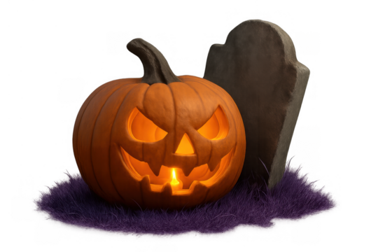 Jack-o'-lantern pumpkin glowing with candle light next to an old gravestone on purple grass, halloween spooky atmosphere, transparent background