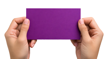 Hands Holding A4 Size Purple Card Isolated on Transparent Background