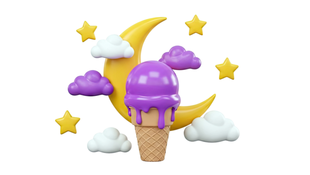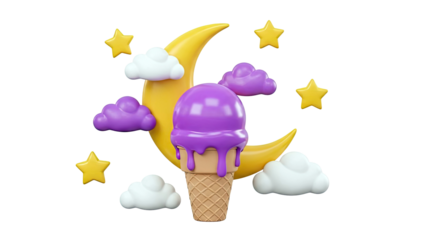 3D Rendered Purple Ice Cream Cone with Moon, Stars, and Clouds